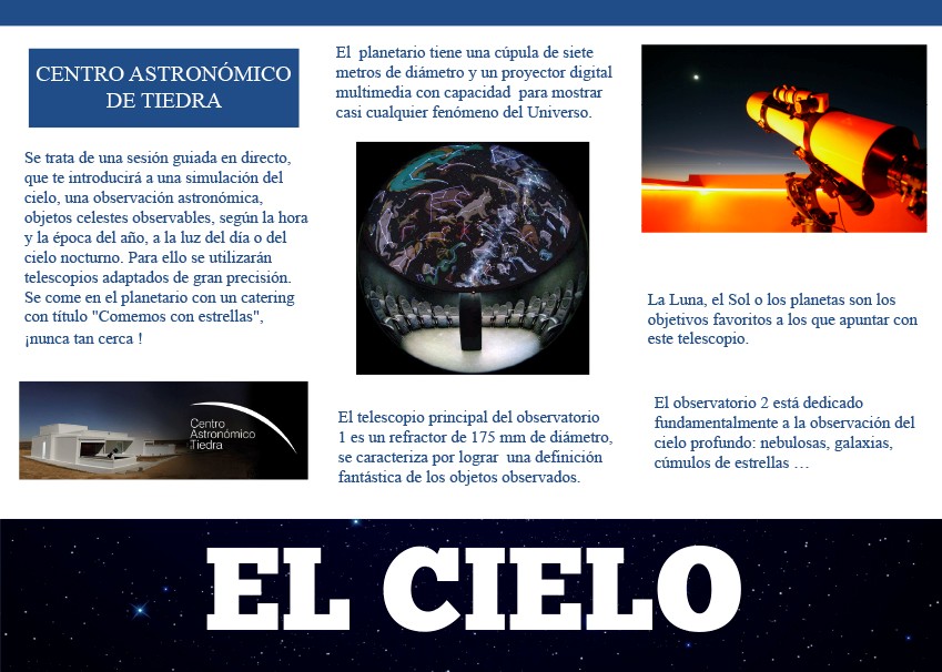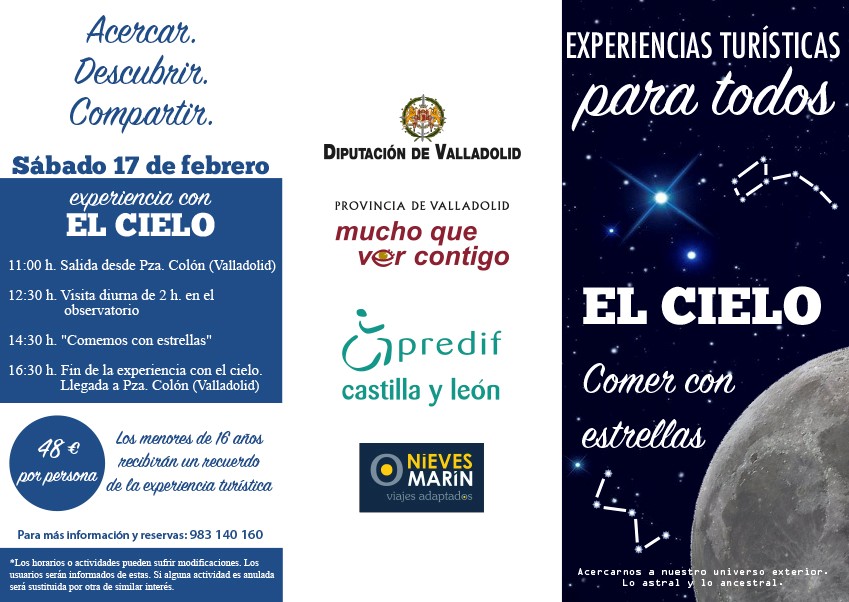 Estas experiencias turísticas, diseñadas bajo criterios de accesibilidad y con una duración de un día, incluyen desplazamiento en autobús desde Valladolid, visita guiada y comida y están articuladas en torno a tres ámbitos: el cielo, el patrimonio y la tierra. La primera, centrada en el cielo, llevará a los visitantes al Centro Astronómico de Tiedra el sábado, 17 de febrero. Allí, disfrutarán de una sesión guiada en directo con una simulación del cielo y una observación astronómica. Para ello, se utilizarán telescopios adaptados de gran precisión.